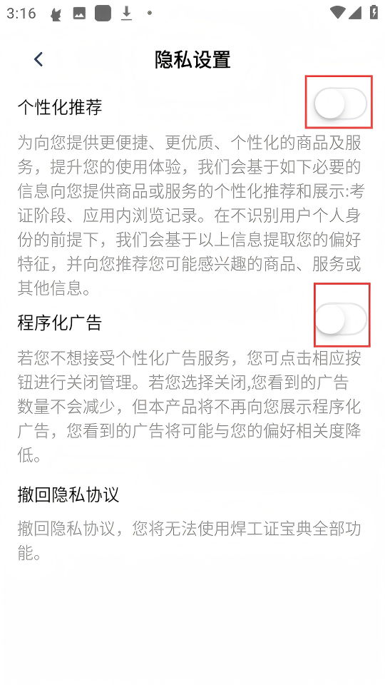 4、在隱私設置頁面可對【個性化推薦】【程序化廣告】等進行開關設置。