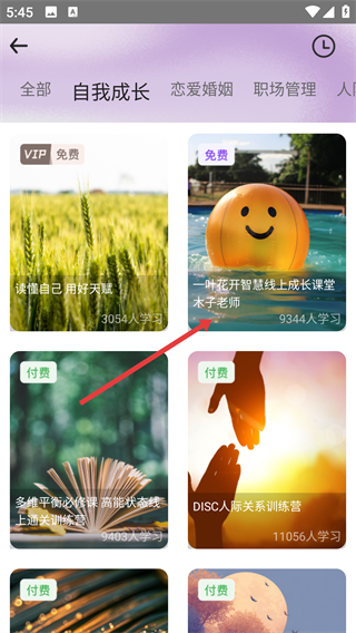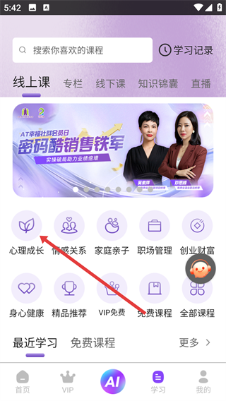 2、在學(xué)習(xí)頁(yè),找到【心理成長(zhǎng)】分類點(diǎn)擊,進(jìn)入心理成長(zhǎng)課程區(qū)域啦。