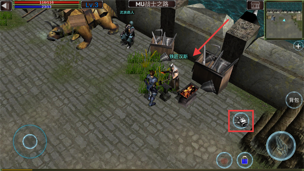 1、與【鐵匠漢斯】交互,利用技能按鈕釋放技能,探索場景獲取資源,提升角色等級與戰斗能力,推進劇情。