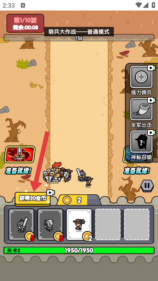 1、戰(zhàn)斗中可獲取金幣(如獲得20金幣),用于招募和升級(jí)傭兵,提升戰(zhàn)力。