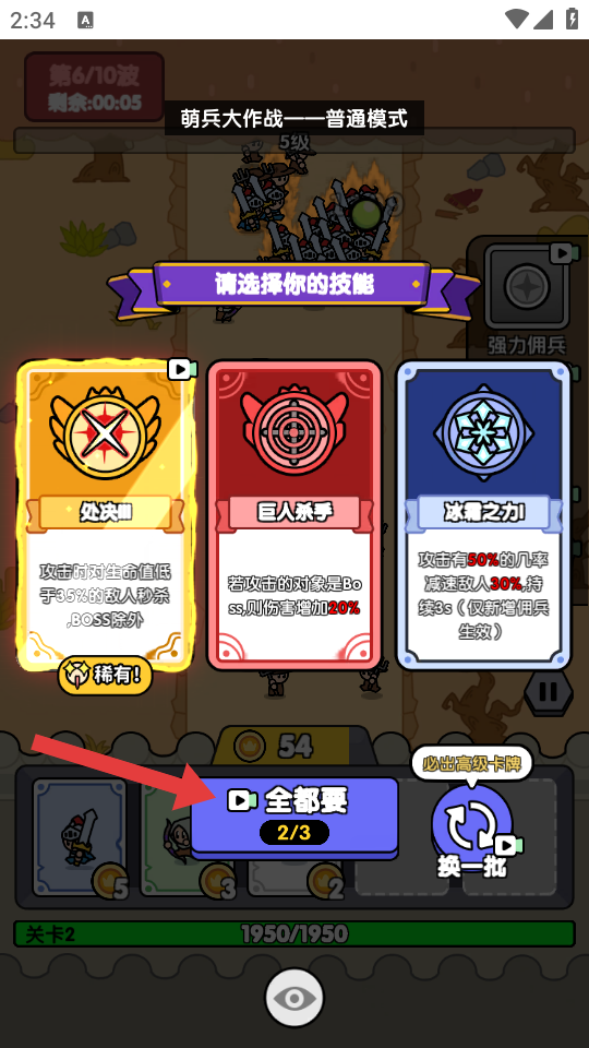 2、技能選擇界面可點(diǎn)擊【全都要】,獲取多種技能(如處決、巨人殺手、冰霜之力),增強(qiáng)戰(zhàn)斗能力。
