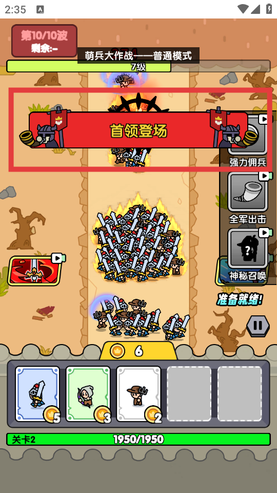 3、戰(zhàn)斗到第10波時(shí)會(huì)出現(xiàn)首領(lǐng),集中火力擊敗首領(lǐng),推進(jìn)關(guān)卡進(jìn)度。