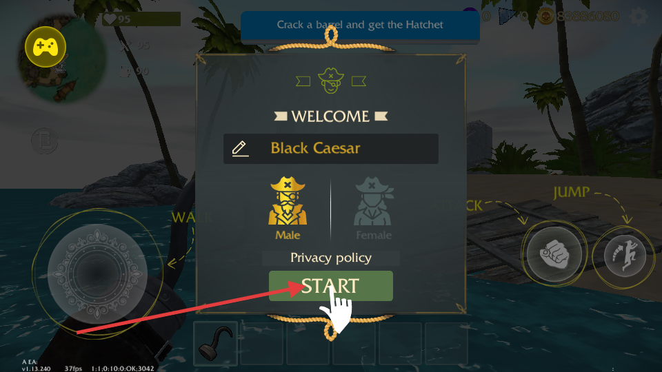 1、點擊【START】開始游戲,選擇角色性別(Male/Female),進入海盜主題的冒險世界。