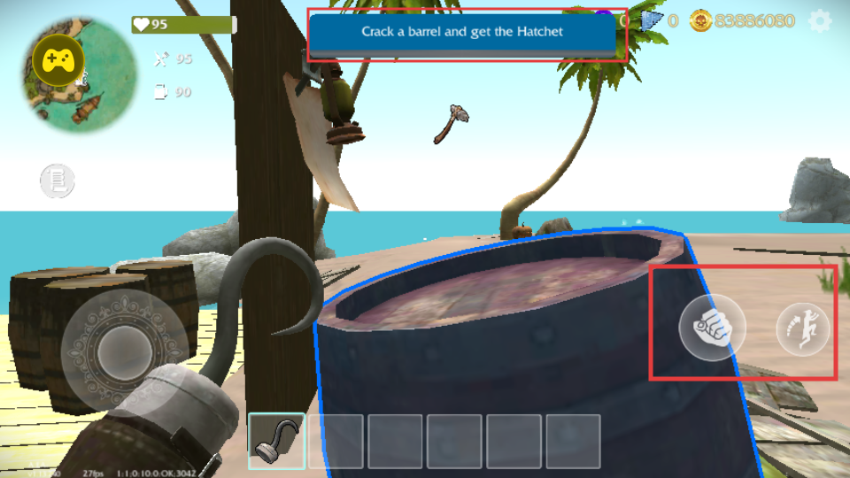 3、與木桶等互動物交互(通過拳頭按鈕),破壞木桶獲取物品,提升角色戰(zhàn)力和資源儲備。