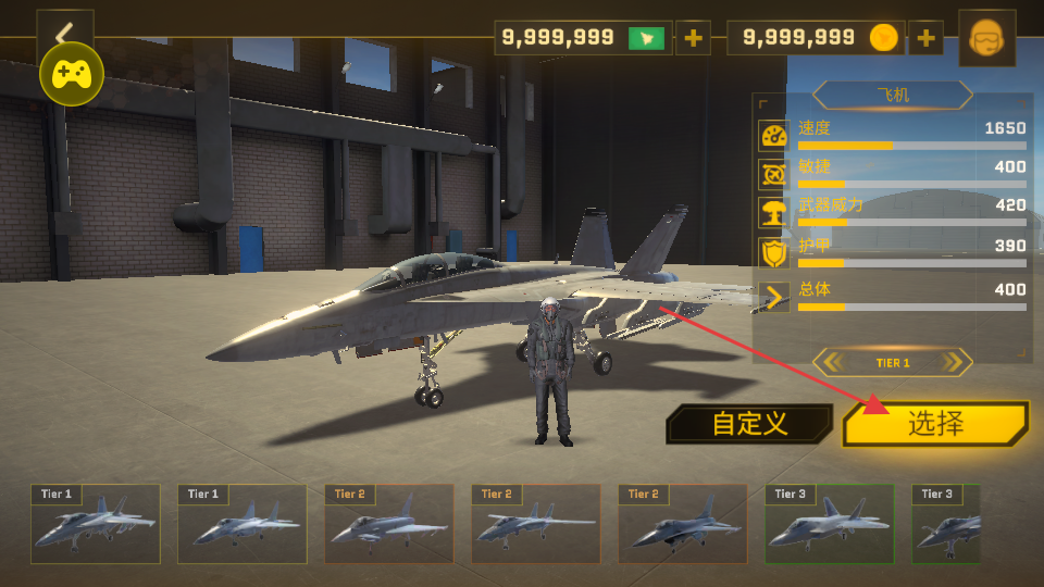 1、在戰(zhàn)機選擇界面,可查看不同等級戰(zhàn)機的速度、敏捷、武器威力等屬性,選擇“選擇”按鈕確定戰(zhàn)機,開啟空戰(zhàn)任務。