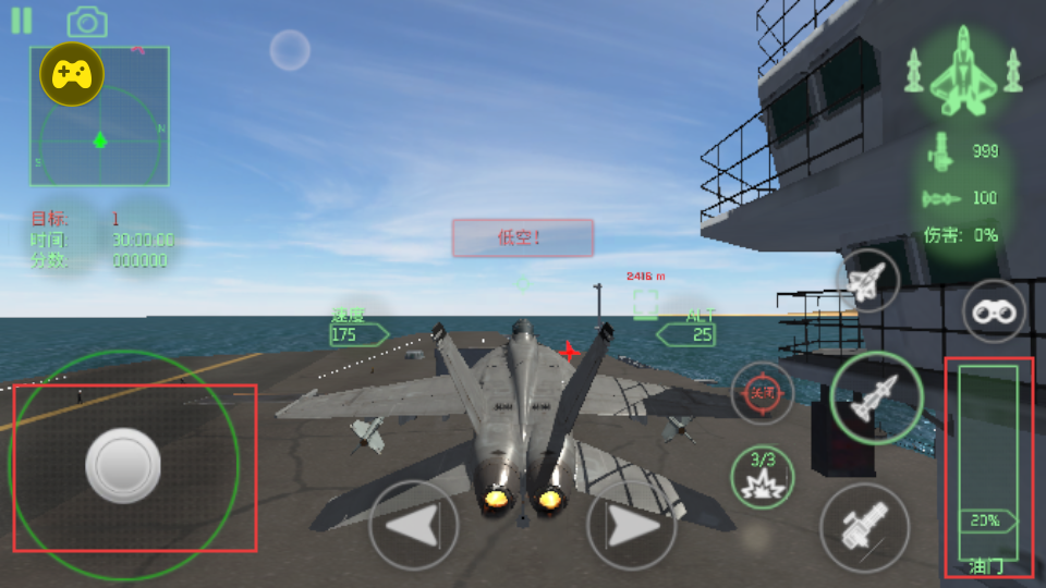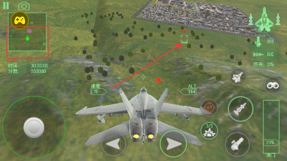 2、通過左側(cè)虛擬搖桿控制戰(zhàn)機移動,右側(cè)油門,關(guān)注雷達和目標提示,調(diào)整油門控制戰(zhàn)機速度和高度,確保飛行穩(wěn)定。