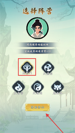 1、選擇【萬劍門】,開局得【兩儀劍陣】且家族劍道資質加10,選后點擊【開始修仙】開啟旅程。