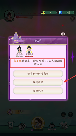 3、遇詩仙醉酒事件,選擇【聆聽詩句】,可獲取感悟,提升自身屬性,助力修仙進程。