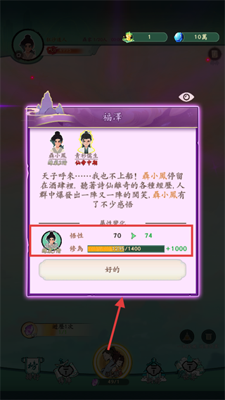 4、游歷后悟性升至74、修為加1000,點擊【好的】確認變化,可繼續后續歷練或活動。