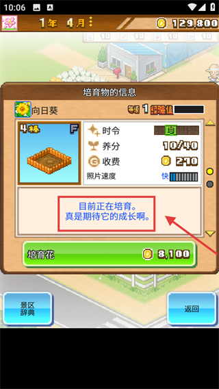 2、培育【向日葵】,消耗【8100】培育費(fèi)及【240】收費(fèi),關(guān)注養(yǎng)分【10-40】,提升等級(jí)以助收益。