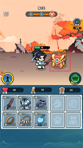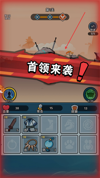 1、首領(lǐng)來襲前,檢查裝備欄中的【攻-5】【血-5】等道具,提升角色【血量-38】【攻擊-15】屬性,為戰(zhàn)斗做好準(zhǔn)備。
