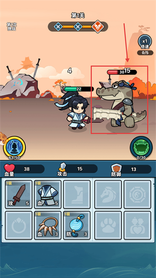 1、進(jìn)入關(guān)卡自動(dòng)戰(zhàn)斗,裝備【攻-5】【血-4】提升屬性,應(yīng)對(duì)鱷魚怪積累經(jīng)驗(yàn)。