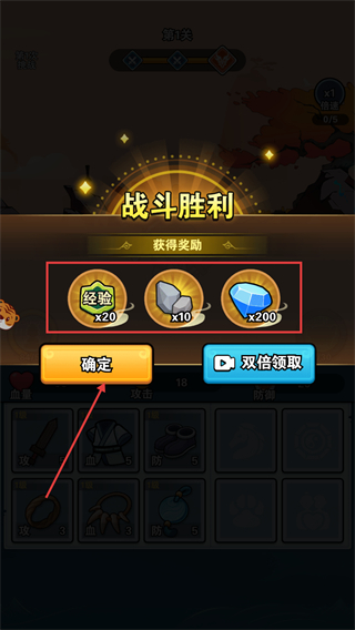 4、戰(zhàn)斗勝利點(diǎn)擊【確定】領(lǐng)【經(jīng)驗(yàn)-乘20】【石頭-乘10】【鉆石-乘200】,積累資源提角色。