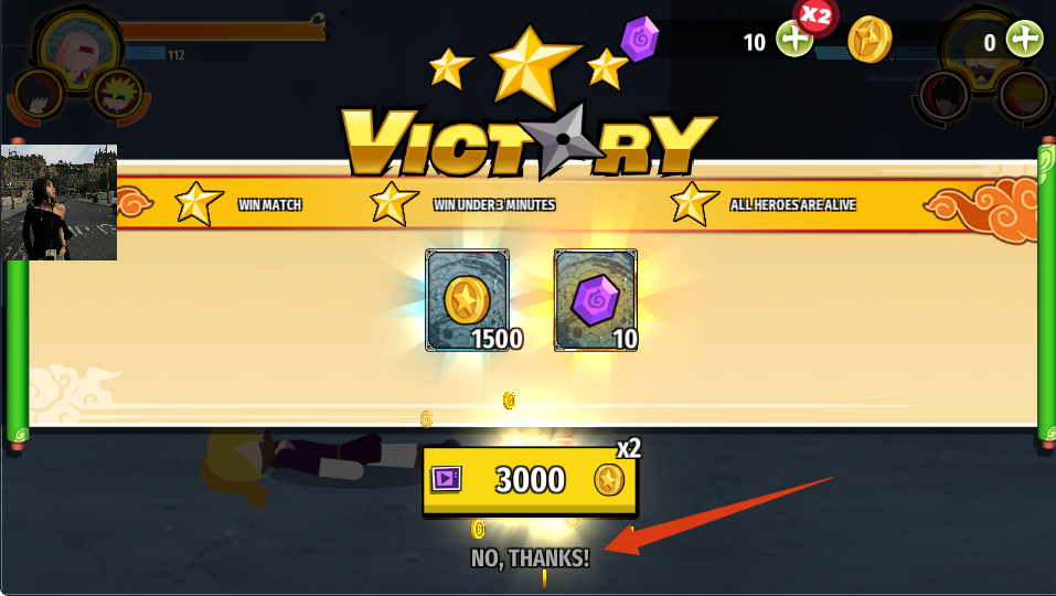 4、成功通關(guān)后,可獲取金幣、紫色寶石等獎(jiǎng)勵(lì),點(diǎn)擊【NO,THANKS!】按鈕領(lǐng)取基礎(chǔ)獎(jiǎng)勵(lì)。