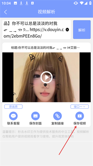 4、在【視頻解析】頁面,點擊【保存視頻】按鈕即可保存解析后的視頻。