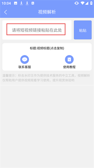 3、在【視頻解析】頁面的輸入框中粘貼短視頻鏈接,再點擊【粘貼】按鈕進行解析。