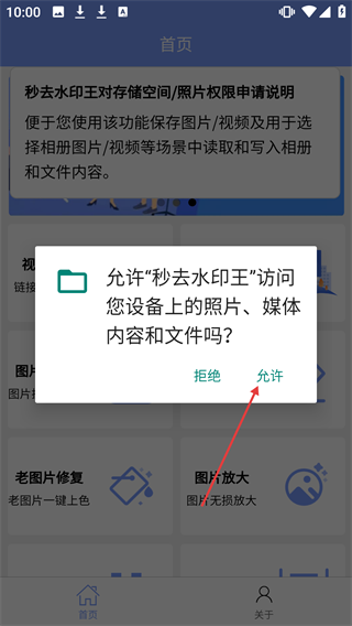 2、在彈出的權限申請框中點擊【允許】,使“秒去水印王”可以訪問設備上的照片、媒體內容和文件。