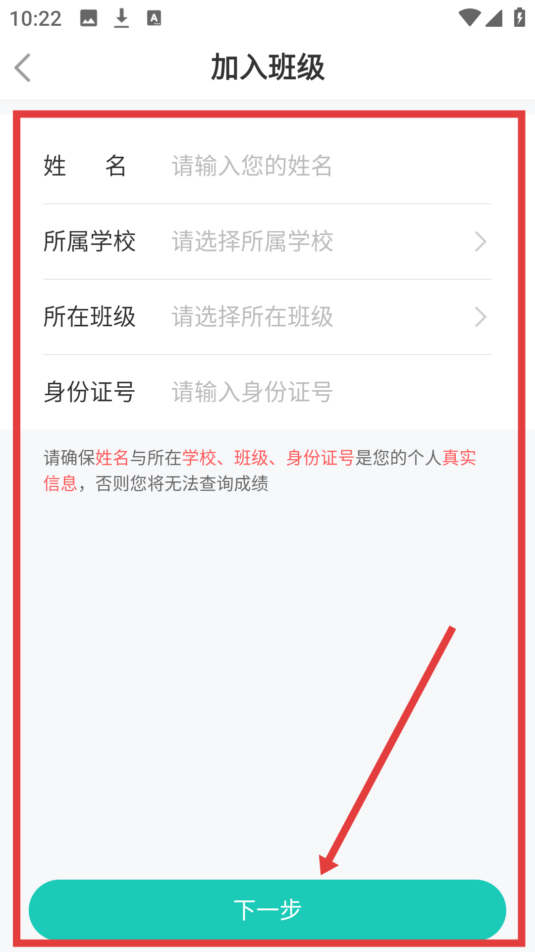 4、在加入班級界面填寫個人信息,點擊【下一步】,即可完成班級加入,使用更多功能啦。