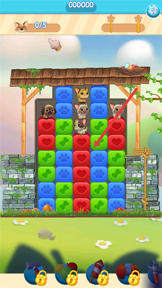 2、消除中間紅色部分,讓上面的小貓小狗落下來即可收集。