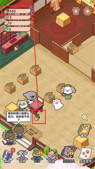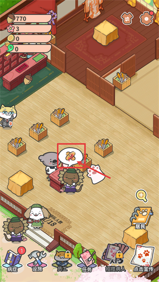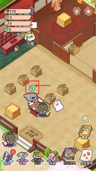 2、進入游戲內場景后,關注界面顯示的【770】松果,點擊紅色框為動物看診查明病因。