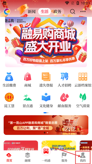 1、在應(yīng)用首頁點擊底部【我的】按鈕,首頁包含生活繳費-商城等服務(wù)入口,可進入對應(yīng)頁面訪問相關(guān)功能。