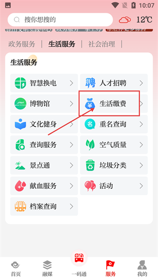 2、在服務(wù)頁面的生活服務(wù)板塊,找到【生活繳費】選項,該板塊還涵蓋智慧換電-人才招聘等生活類服務(wù)。