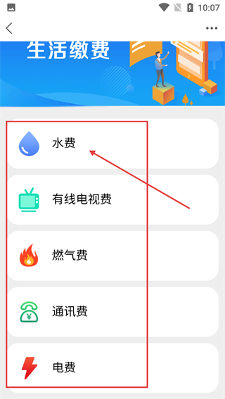 3、進入生活繳費頁面后,可選擇【水費】等繳費項目,該頁面包含水費-電費等多種生活費用的繳納入口。