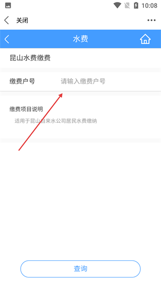 4、進入水費繳費頁面,需填寫【繳費戶號】,該頁面適用于昆山自來水公司居民水費繳納,輸入后可點擊查詢。
