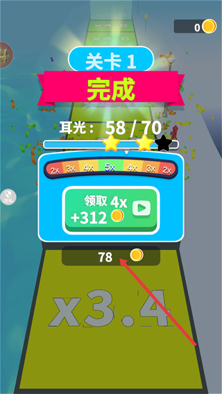 4、關(guān)卡完成后,查看【耳光-58/70】的進(jìn)度數(shù)據(jù),點擊對應(yīng)按鈕領(lǐng)取【78】金幣獎勵。