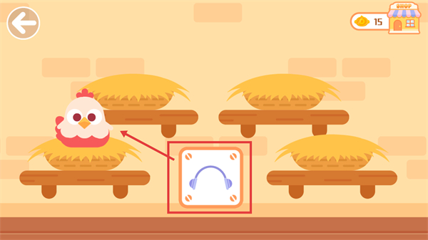 2、進入雞窩場景后,點擊標注的【耳機】道具,將其應用到小雞處,滿足小雞當前的需求,推進互動流程。