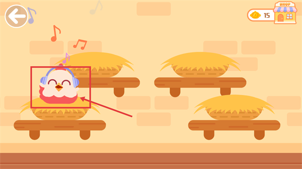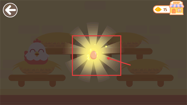 1、界面顯示金幣【15】,點擊小雞旁標注的感嘆號區域,觸發小雞的需求提示,準備從右側道具欄選對應道具滿足需求。