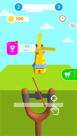 1、移動手指操控彈弓瞄準風車目標,通過調整角度對準風車上的紅色角色,準備發射。