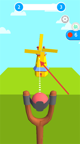 2、確認瞄準軌跡后發射彈丸,讓彈丸沿虛線路徑擊中風車區域,推進關卡進程。