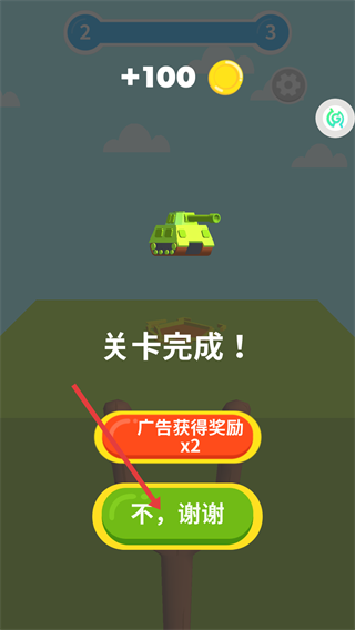 4、關卡完成后,可選擇【不-謝謝】跳過廣告,或觀看廣告獲取【x2】獎勵,結束當前關卡。