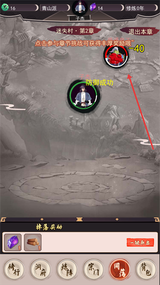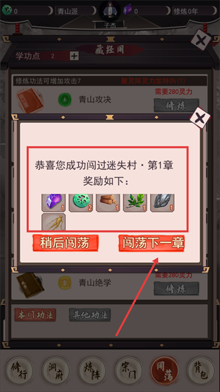 1、完成【迷失村·第1章】挑戰后點擊闖蕩下一章獲取更多資源助力快速積累修仙所需的材料與道具。