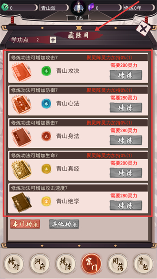 2、在【藏經閣】優先選擇增加攻擊的【青山攻決】修煉提升戰斗能力為后續章節挑戰打下基礎。