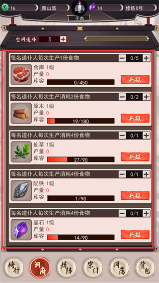 3、洞府中合理分配道仆到【食庫】【原木】生產項升級建筑提升產量保障修仙資源穩定供給。