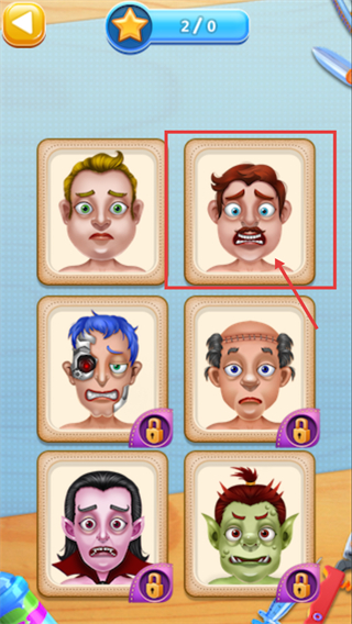 1、界面顯示星星【2/0】,點擊標注的棕色頭發角色,進入對應的手術模擬關卡,開啟該角色的手術操作流程。