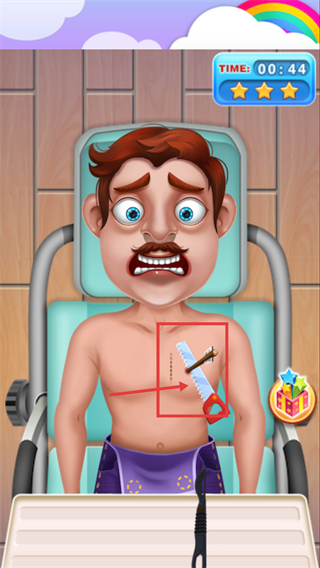 2、進入手術場景(時間【00:44】),點擊標注的電鋸工具,處理角色身上的傷口,推進本次手術的治療步驟。