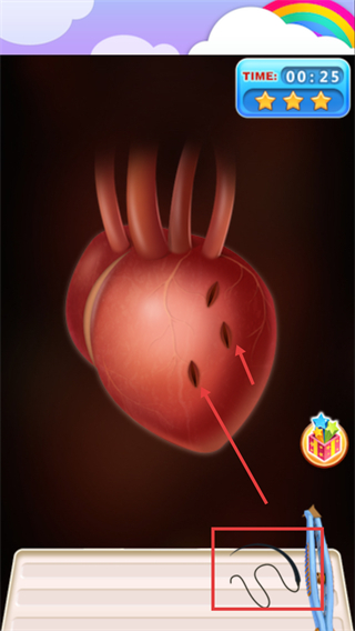 3、手術時間剩余【00:25】,點擊標注的工具,修復心臟上的傷口,完成手術的核心治療環節。