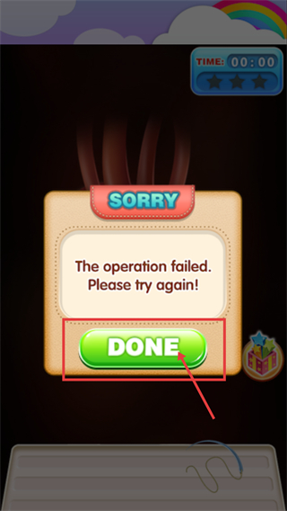 4、手術超時失敗,顯示【SORRY】提示,點擊標注的【DONE】按鈕,關閉提示并重新嘗試本次手術關卡。