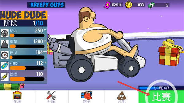 1、確認角色【NUDE-DUDE】的屬性(如【速度-184】)后,點擊【比賽】按鈕進入對局。