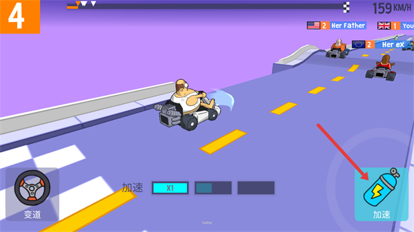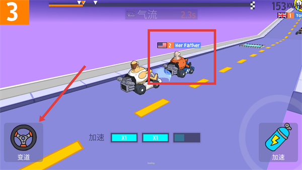 3、利用【變道】功能靠近對手【Her-Father】,借助加速功能嘗試超越,提升排名。