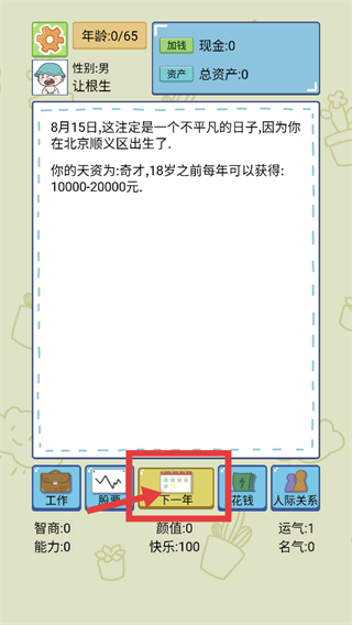 1、界面顯示年齡0、現金0,點擊標注的【下一年】按鈕,推進人生流程,獲取天賦對應的10000-20000元收益,開啟人生模擬的發展階段。