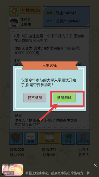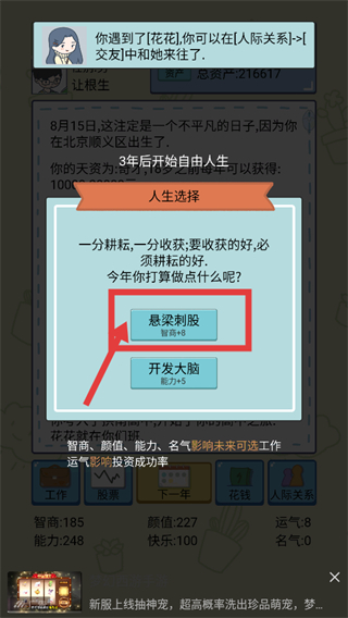 2、進入人生選擇界面,點擊標注的【懸疑炒股】選項,提升智力屬性,同時推進人生進程,積累資產與屬性值。