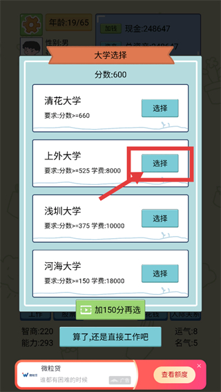 4、大學選擇界面顯示分數600,點擊標注的【上外大學】對應的選擇按鈕,消耗8000費用進入該校,開啟大學學業流程。