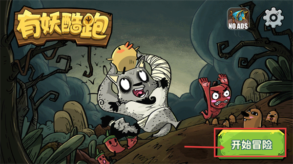 1、界面顯示【有妖酷跑】標識,點擊標注的【開始冒險】按鈕進入酷跑關卡,開啟妖怪主題的跑酷冒險流程,推進游戲進度。