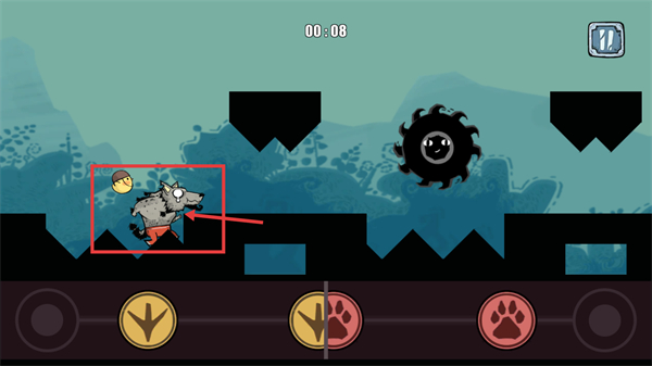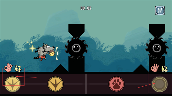2、進入跑酷關卡(時間【00:02】),點擊標注的方向按鈕操控角色,躲避黑色齒輪陷阱,同時收集道具,推進跑酷進程。