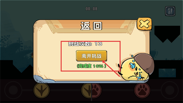 4、挑戰界面顯示完成度【10%】、挑戰次數13,點擊標注的【離開挑戰】按鈕結束本次跑酷,后續可重新開啟冒險。