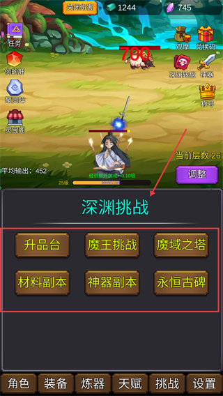 1、進入【深淵挑戰】界面,優先選擇【魔王挑戰】功能,通過挑戰或掃蕩快速積累資源提升實力。